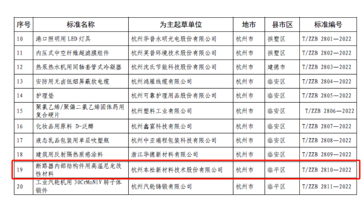 终于,本松迎来首个主起草团标,由本松新材主起草的《断路器内部结构件用高温尼龙改性材料》标准,在正泰、德力西等头部客户及行业专家指导下,在行业兄弟单位支持下,已由浙江省品牌建设联合会批准成为“品字标”团体标准,编号为T/ZZB 2810—2022,将于2022年12月31日起实施。